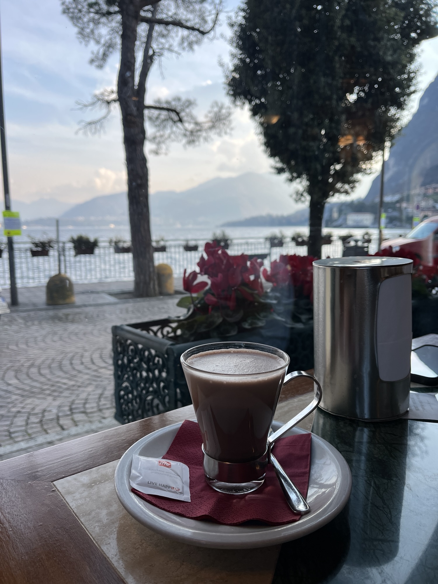 Après une nuit proche de l’aéroport de Milan, on a pris le Malpensa Express (13€ – environ 50 minutes) jusqu’à la gare centrale de Milan, puis un train direct pour Varenna (7,20€ – 1h de trajet). Et là… première claque visuelle : les eaux scintillantes du lac, les montagnes tout autour… un petit air de carte postale à l’italienne.